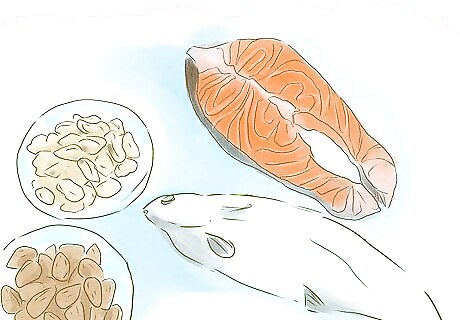 Include healthy omega 3 fats. Another group of foods that is commonly associated with improve cholesterol levels are foods that contain healthy fats. These fats, known as omega 3 fats, can help improve and manage your cholesterol levels. You can find these in high amounts in healthy foods like flax seeds, chia seeds, and walnuts. Studies have shown that those people who eat more of these heart healthy fats typically have higher HDL levels ("good" cholesterol), lower total cholesterol and triglyceride levels. Omega 3 fats are found in a wide variety of foods like salmon, tuna, mackerel, nuts or avocados. However, not all of these are the best snack foods. Instead try foods like: salmon or tuna jerky, a small handful of nuts (maybe mixed with oat granola) or avocado.