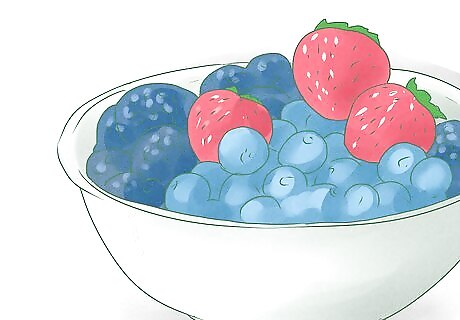 Snack on fruit. Another great snack option is fruit, like oranges, apples, and berries. This food group offers a lot of fiber (especially soluble fiber), vitamins and is relatively low in calorie making it a great option for a cholesterol lowering snack. Some fruits have higher levels of pectin which is a soluble fiber. Similar to oats, soluble fiber helps your body decrease circulating levels of cholesterol by limiting absorption. Like all foods, fruit needs to be portion controlled. Measure out about 1/2 cup of chopped fruit or have 1 small piece of fruit. Limit your daily intake to 1 1/2 to 2 cups per day. If measuring dried fruit, consider a 1/2 cup of dried fruit to be the same as 1 cup of fresh fruit. The fruits with the highest levels of soluble fiber include: apples, grapes, pears, citrus fruits, peaches, apricots and strawberries. To incorporate these fruits into your snacks, just eat them plain, dice them up into a salad, add to a bowl of high fiber oatmeal or add on top of a yogurt.