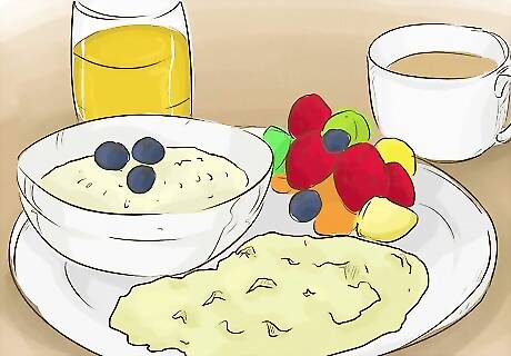 Choose oatmeal or oat based snacks. You may know from TV commercials that oatmeal or oats can help lower cholesterol. This high fiber grain has been shown to help lower cholesterol levels making it a great food to include in a snack. Oats contain a type of fiber known as soluble fiber. This particular type of fiber (also found in foods like beans, apples, prunes and barley), helps decrease circulating levels of LDL or "bad" cholesterol in your body by binding to dietary cholesterol in the gut and preventing its absorption.. Since oatmeal falls into the grain food group, you need to follow appropriate portion sizes for grains. Measure out about 1/2 cup of cooked oats or about 1 oz of oats per serving. Incorporate oats into your favorite snacks. Try: having a small bowl of oatmeal in the afternoon, a homemade granola bar made with oats, making homemade granola with oats (sprinkle over your favorite yogurt) or using oat flour to make high fiber cookies or muffins. Oats and oat flour will also add additional nutrition to your baked goods. Try mixing oat flour into your next batch of donuts, for instance!