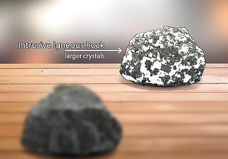 Examine the rock for large particles to determine if it is intrusive. Intrusive igneous rocks have minerals in the rock are very easy to see. These will differ in color and texture, and you won't need a magnifier to spot them. Intrusive igneous rocks are created from magma that has solidified underground. Large minerals form because it takes a long time for the magma to cool underground. Granite is a common type of igneous rock that cools underground.