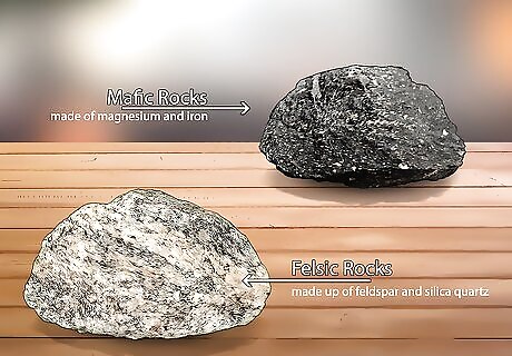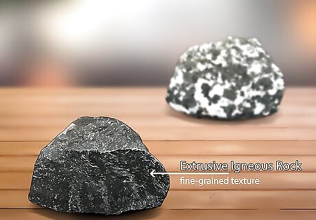Check the rock for tiny particles to determine if it is extrusive. Use a magnifier to see if you can spot different colors or textures on the surface of the rock. Extrusive rocks form from lava that has flown onto the earth’s surface. When the lava is exposed to the atmospheric temperatures, it cools down very quickly which stops large minerals from forming. Basalt is a very common type of igneous rock—it forms when lava flows and cools on the earth's surface.
