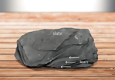 Look at the band color in rocks that have layers. Metamorphic rocks with dark bands are usually slate, while rocks with light and dark bands are usually gneiss. You might need to use a magnifier to see the different bands in the rock. The bands in the rocks are formed by the temperature of the environment where the rock was formed.