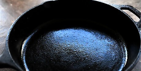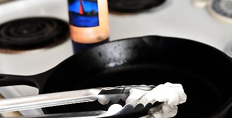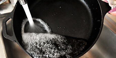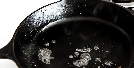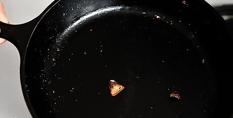 Add approximately 2 tablespoons (30 ml) of salt and, with a paper towel bunched up and held in some tongs (Caution Hot Iron), use the paper towel and the salt to scour the bottom and sides of the pan, until the brown bits are gone (the salt will be dirty).