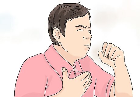Practice controlled coughing. As you tap your chest and recline for postural drainage, phlegm and mucous will begin to loosen in your lungs. To cough up phlegm, sit down and lean slightly forward in a chair. Fold your arms over your stomach, and lean forward. As you press down on your stomach, cough 2 or 3 times. Pause for a few seconds, and then repeat. As the phlegm comes up from your lungs, spit it out into a tissue, trash can, or other nearby receptacle. Practice controlled coughing to avoid coughing fits, which often cause your trachea and other airways to constrict.