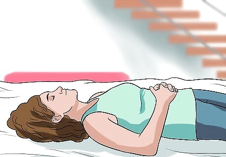 Recline in different positions for postural drainage. Lying in a variety of poses will help loosen phlegm and allow you to cough up mucous. First, lie on your back and prop pillows under you to elevate your hips. Then, lay on your right side with 2 pillows under your right hip. Rotate, and lay on your left side with 2 pillows under your left hip. Finally, lay on your stomach with 2 pillows under your hips. Stay in each position for 5–10 minutes. The medical term “postural drainage” simply means adjusting the position of your body so that phlegm can drain from your lungs.