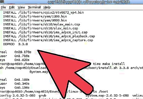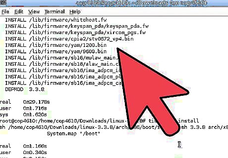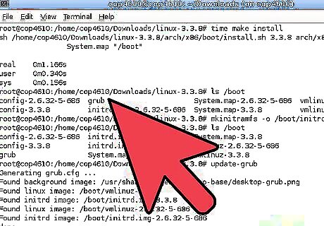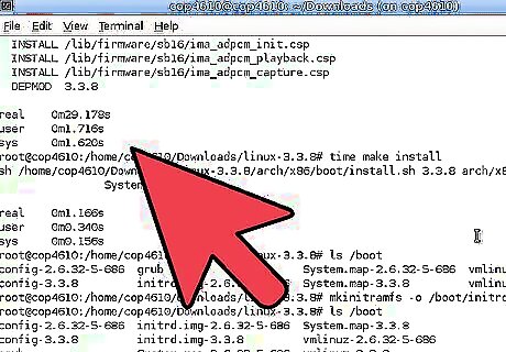 Compile and install the kernel. You can run needed commands in one line by separating them with double ampersands (&&) as written below. This may take a long time. make && make modules_install && make install You may want to use -j option with make. This allows to fork additional processes for compiling kernel, syntax would be "make -j 3". 3 here represents the number of processes to be created.