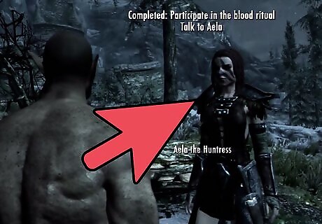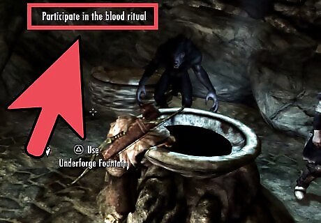 Begin the ritual. Aela will transform into a werewolf, and Skjor will knife her arm and pour some blood on the fountain in the middle of the room. Approach the fountain and press the “Activate” button on your controller to have your Dragonborn drink the blood from the fountain.
