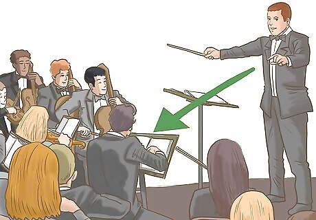Point toward a certain section to cue them in. A conductor can also cue in certain sections of the orchestra or choir during the piece. Look and point toward the section a beat or 2 before their part is coming up. Then, slowly raise your hands or baton on the first beat of their part. This will help them enter the song on the right beat and keep the entire group sounding cohesive. It’s important to do this when a certain section of the band or choir, such as the trumpets or bass section, are entering or reentering the song or piece.