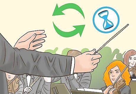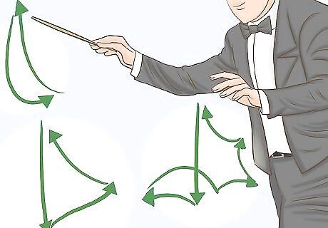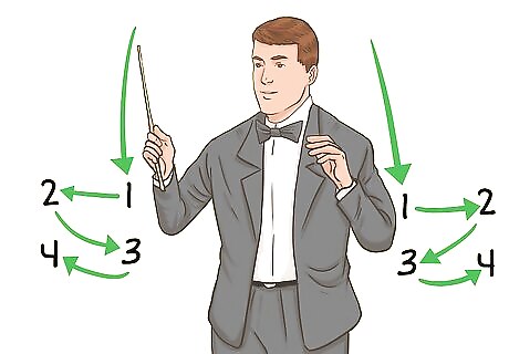 Vary the conducting shape for different songs. The time signature for many songs is 4/4 (common time) or 2/4 (cut time), but you may encounter songs with other time signatures. The time signature indicates how many beats are in each measure. Practice conducting songs in different time signatures until you find a natural pattern for your hands to follow.