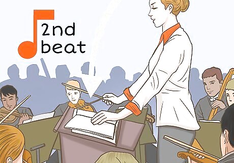 Sweep your baton or hands down and to the side on the second beat. If you're using a baton, sweep it down to one side of the conducting space when the second beat hits. If you're using your hands, bring them both down and out to the sides of the conducting space on the second beat. Make sure not to cross your hands—they should mirror each other instead.