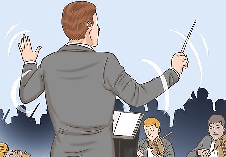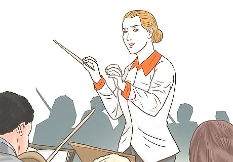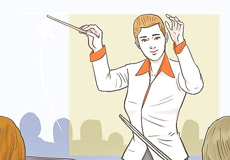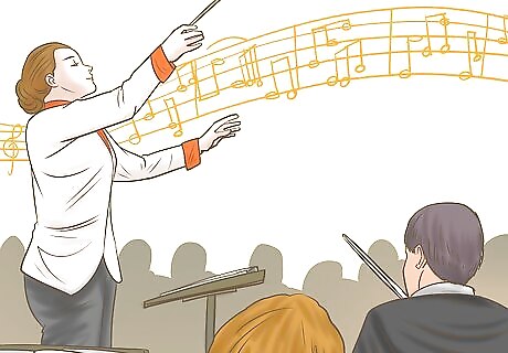 Develop your own style as you get more experience. Some conductors are swift and precise, staying within their conducting box throughout the entirety of the performance. Other conductors are emotional and use wide, dramatic movements to really energize their band or choir. Watch different famous conductors and take note of their style. Try to develop one that’s inspired by someone while injecting some of your own personality into the conducting. Famous conductors include Gustavo Dudamel, Nadia Boulanger, and Lorin Maazel.