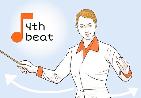 Bring your hands or baton down to the edges of the conducting space on the fourth beat. Continue to follow the pattern so that you hit the focal point on the odd beats (1 and 3) and move your hands or baton to the edge of the conducting space on the even beats (2 and 4). The entire shape should look something like a cross if you're using both hands.