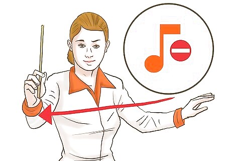 Cut off a section by moving your baton or hands in a straight, horizontal line. If there is a part of the song where one section of the band needs to stop playing immediately, you can cut off the section. Look at the section you want to cut off and move your baton from one side of the conducting space to the other exactly on the beat they are supposed to stop. If you're using your hands, start with them together at the focal point and bring them apart to each side of the conducting space. This will help them stop playing together and will keep the song sounding crisp. This movement should be quick and stiff to signify that it's a cut off rather than a beat.
