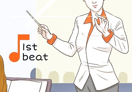 Move your baton or hand to the focal point on the first beat. Smoothly bring your baton or hands from the top of the conducting box and land on the focal point just as the first beat hits. Practice getting this basic motion down since it's a critical movement in conducting. Put a slight bend and snap in your wrist to emphasize each beat.
