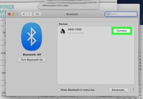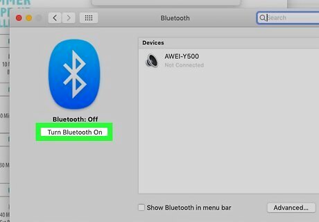 Click Turn Bluetooth On. You'll see this under the large Bluetooth logo on the left side of the window. You should see your speakers appear in the panel on the right side of the window. If not, make sure your speakers are in pairing and discovery mode. There's also a checkbox you can check to add the Bluetooth symbol to your menu bar so you don't have to go into System Preferences every time you want to use Bluetooth.