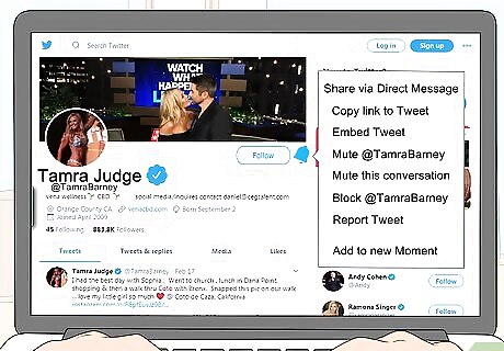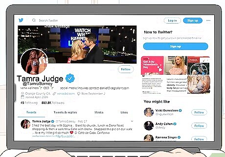 Adjust your Twitter settings so you can reply promptly to her posts. Find Tamra’s profile on Twitter by searching her handle, which is @TamraBarney. Find the bell icon in the top right corner of her profile page, directly next to the blue “Following” button. Press that button to access a drop-down menu, which will give you the option to subscribe to all of her tweets or just her live videos. After changing your settings, wait for her to post an update or photo so you can leave a heartfelt or thought-provoking comment! Try to avoid leaving a cliche comment, like “You inspire me so much!” While the comment itself is nice, Tamra won’t have much to say in response. Instead, try to post something like “You’re such an inspiration to me! What are some things that motivate you to get through the day?”