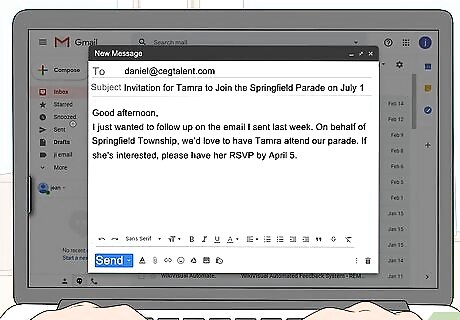Send out a follow-up message if you don’t hear back in 1-2 weeks. Since Tamra’s agent probably has to read a lot of email, don’t expect a reply right away. Instead, check your email on a daily or weekly basis. If you want to be professional, wait at least 1 week before sending a follow-up message to her agent. In this message, be as succinct as possible and mention any time-sensitive information that they should keep in mind. For instance, try writing something like this: “Good afternoon,I just wanted to follow up on the email I sent last week. On behalf of Springfield Township, we’d love to have Tamra attend our parade. If she’s interested, please have her RSVP by April 5.”