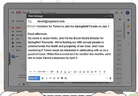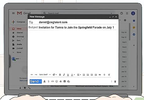 Write an engaging subject line that will interest Tamra’s agent. Try to include as much relevant, detailed information as possible in the title. Since Tamra’s agent likely fields a lot of email, you want to make sure that your message is as clear. If you’re trying to book Tamra for a special event or function, mention the date and organization specifically. Avoid using broad and uninteresting language, as this won’t express your point very well. For instance, instead of saying “Inquiry About Local Event,” try writing something like “Invitation for Tamra to Join the Springfield Parade on July 1.” Don’t use clickbait in your email header, as it’s misleading and won’t help inform Tamra’s agent on why you want to contact her.