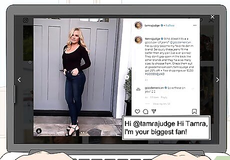 Reply to her Instagram posts and photos with thoughtful comments. Check the settings of Tamra’s Instagram profile to see if you can subscribe to notifications about her latest posts. When she posts a picture or status update, try to come up with a creative and engaging reply that Tamra might reply to. Avoid posting cliches or other short messages that won’t start a conversation. If Tamra posts a picture of herself with her well-known friends or former co-stars on social media, try engaging with those people in the comments as well. If you tag another celebrity, there’s a higher chance that she’ll see your comment!