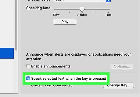 Check the box next to "Speak selected text when the key is pressed." You can find this option at the bottom. When it's enabled, you can use a keyboard combination to convert text to speech in any app. The default key combination here is ⌥ Option+Esc. If you want to set a new combination, just click Change Key. If you want text-to-speech to announce every new window that pops up, you can also check the Enable announcements box here.