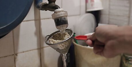Rinse 1 cup (190 grams) of quinoa in a fine mesh colander. Run water over your uncooked quinoa for at least 30 seconds and drain it thoroughly. Rinsing your quinoa before cooking will remove any potential bitterness from its coating. Saponin naturally occurs and coats quinoa, which can give it a soapy or bitter taste if it is not removed prior to cooking.