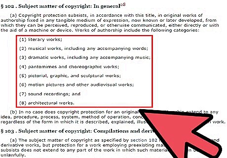 Determine the category under which you will register the copyright of your blog. The categories of copyright are wide-ranging and include: literary works musical works, including any accompanying words dramatic works, including any accompanying music pantomimes and choreographic works pictorial, graphic, and sculptural works motion pictures and other audiovisual works sound recordings architectural works