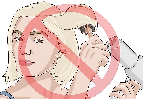 Skip the heat. If possible, allow your hair to air dry instead of using a hair dryer. Heat will dry your hair out further, making the damage worse. If you cannot skip the hair dryer completely, let your hair air dry mostly, then touch it up by drying the remaining moisture with the cool heat setting of your dryer. Consider misting your hair with a heat protecting spray before drying it. Even if you blow dry your hair, it's vital that you completely skip the flat iron and curling iron while restoring the health of bleached hair. You can get sponge rollers to curl your hair without heat. They are long and thin. You can roll up your hair with them. They are bendable. You can clamp and leave them overnight to make your hair more curly or do it in the morning. Otherwise, you can do the hook-and-loop fastener rollers. Blow dry your hair and roll the hook-and-loop fastener roller. When you remove them, the hair will have a wave.