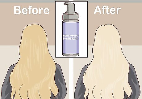 Consider enriching your hair with a neutralizing gloss. A neutralizing gloss is a hair treatment that revitalizes dyed hair, giving it a glossy sheen. Selecting a neutralizing gloss will tint your hair with a color that balances out brassy tones, leaving you with “pure” blonde hair. You can apply a brass-breaking foaming gloss at home. It's important to select a formula designed to remove yellow/orange tones from your hair, however, since basic formulas only add shine without correcting color. Apply the gloss to your hair after washing and rinse it out after three to five minutes; repeat one to three times a week until the problem is fixed. Check the label instructions when using a home gloss treatment. Some should be applied after shampooing but before conditioning, while others should be applied after both shampooing and conditioning.