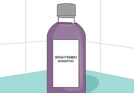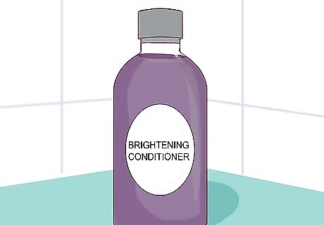 Moisturize with a brightening conditioner. While following your shampooing with a normal conditioner will protect your hair from damage, following up with a brightening conditioner will both nourish your hair and further your color-correcting efforts. When possible, try to use a conditioner that matches the brand and product line of your brightening shampoo. Like your shampoo, your conditioner should also be a cool-hued blue or purple to help balance out the warm brassy shades in your hair. Label instructions may vary, but typically, you’ll need to apply the conditioner after shampooing and leave it in for about three minutes prior to rinsing. Most brightening conditioners should not be left in the hair without rinsing.