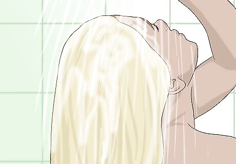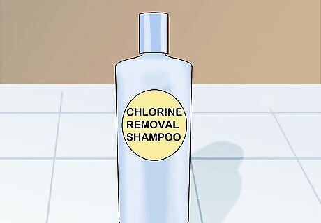 Use a chlorine removal shampoo. Chlorine in either pool or bath water can cause blonde dye to turn green, so using a chlorine removal shampoo should restore your hair back to the intended blonde hue. Look for chlorine removal shampoos containing thiosulfate. Apply the shampoo as you would apply any other shampoo when washing your hair. If you don't have chlorine removal shampoo, try rinsing your hair with club soda, tomato juice, or lemon juice after exposing it to chlorine-heavy water. These natural remedies may remove most of the green tint.