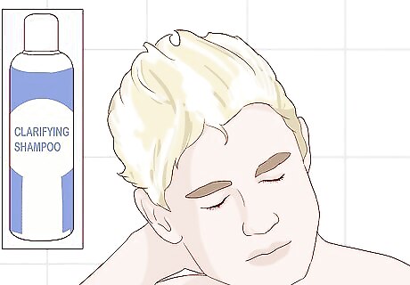 Use clarifying shampoo. Blonde dyed hair is usually the result of product buildup. If your hair color looks dull, try washing it with an anti-residue shampoo to remove that buildup. Alternatively, you might consider an apple cider vinegar rinse instead of a clarifying shampoo. Mix one part apple cider vinegar with five parts water. Spray this solution directly onto your scalp, then lather it in with your fingertips until it feels fizzy. Rinse it out with cool water and skip the shampoo afterward. Regardless of whether you use clarifying shampoo or apple cider vinegar, you should follow the wash with a light conditioner to maintain a healthy amount of moisture.