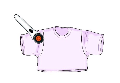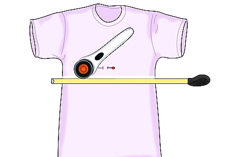 Use a rotary cutter to cut a straight line across the width of the shirt under the line. Place the rotary cutter next to the hard plastic ruler to ensure you get a straight line.