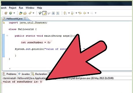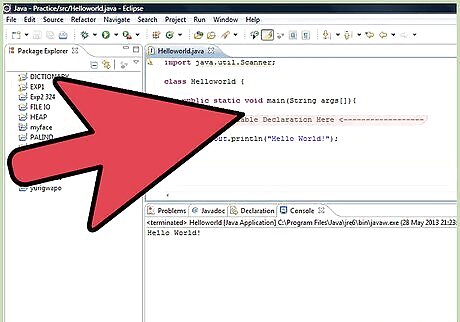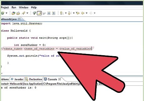 Scroll to a place where you want to insert the variable. Remember: If you place a variable in the main class, you can reference it anywhere. Choose the type of variable you need. Integer data types : Used to store integer values like 3, 4, -34 etc byte short int long Floating Point data type : Used to store numbers having fractional part like 3.479 float double Character data type: Used to store characters like 's', 'r', 'g', 'f' etc char Boolean data types : Can store either of the two values: true and false boolean Reference data types : Used to store references to objects Array types Object types like String