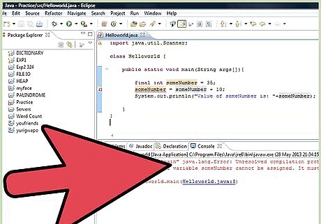 Protect variables from being edited later, optionally, by adding "final type name" between the parentheses in the second line of your code (public static void main). final int someNumber = 35; Adding the 'final' here means that the variable 'someNumber' cannot be changed later