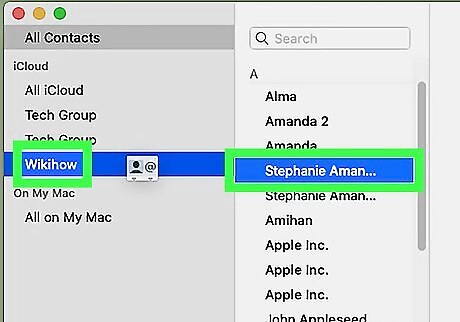 Add contacts to the group. Go to All Contacts in the top left. Click to drag individual contacts over and drop them on to the new group. You can also click and hold the Cmd button on a Mac (Ctrl on a PC) as you click each contact you wish to add to the group. Then drag them over and drop them on to the new group.