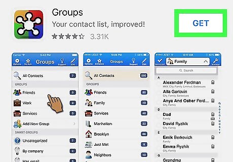 Find a third-party app on the app store. Tap on the App Store to open, and then tap Search at the bottom. Type in your search query—try “contact groups” or “contact manager”. Tap on an app to learn more about it. Tap Get to download. When deciding on an app, you may want to consider factors like price and ratings. There are many good quality free apps available. “Groups” is a popular and highly rated app.