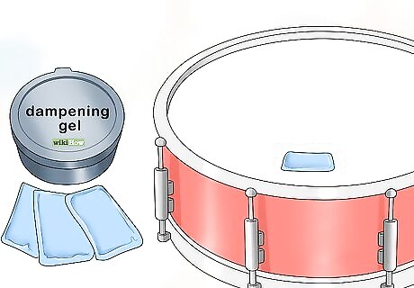 Place dampening gel on the batter head of your snare or tom drum. A few companies offer these small gel pads, which stick to the drum head and offer light dampening. Put it in a spot where you will not hit it when you play. Slowly run your thumb around the top of the drum in a circle, about 1.5 inches (3.8 cm) from the rim, while striking the center of the drum. Take note of the position of your thumb when the drum muffles best - this is usually a good place to stick the gel. Move the gel around and listen to the different timbres you create by placing the gel in certain spots. Add another gel pad or two if you want more muffling. If you find the gel to dampen more than you'd like, most muffling gels can easily be ripped into smaller pieces. In a scenario where the use of muffling gel is for a temporary function such as recording, be sure to put the gel back in its case, as it will dry out and lose its stickiness.