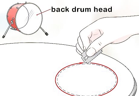 Cut a hole in the back drum head to reduce resonance. The drum head is the head that is not struck by the pedal. Use a razor blade and cut somewhere between the rim and the center of the drum. Use a bowl or coffee can to outline the cut. A bigger hole results in less resonance.