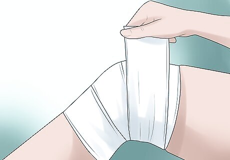 Compress your knee using a bandage. Compression will reduce swelling and pain. Compression will physically reduce the swelling and enhance blood drainage from that area. Using an elastic bandage, wrap the knee starting from below the knee, and extend the bandage up past the top of the knee. The wrap should not be too tight; otherwise it will cut off circulation to the leg and ankle. Re-wrap the if bandage if it is too tight. Remove the bandage before going to sleep.