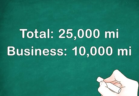 Keep a record of deductible mileage. Over the course of the year, track and record your total mileage and the mileage that you traveled for business purposes. Do not include mileage traveling between home and work as business mileage. You will need both the total mileage and the business mileage in order to make the necessary calculations. For example, suppose that on Jan. 1 you bought a new car that you use for both personal and business purposes. Therefore, at the start of the year, the odometer reading is at 0. At the end of the year, the odometer is at, for this example, 25,000. Out of that 25,000, you recorded that 10,000 was used for business. Therefore, your total mileage is 25,000, and your business mileage is 10,000. You will use these figures to calculate your deduction.