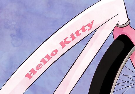 Apply stickers designed for outdoor use. Outdoor-use stickers, such as those designed for bikes or skateboards, are a great way to personalize your bike and come in many different designs and colors. Although you can use regular stickers, dirt and moisture will quickly break them down. To make sure your sticker will be placed the way you want it to be, consider marking where you’d like it with a pencil before application. Many skate and bike shops sell these stickers, but you can also find them online through popular vendors such as Amazon, and online bike specialty stores.