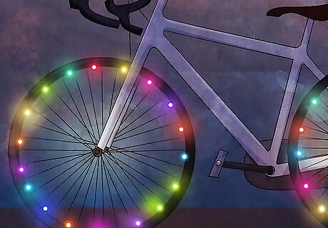 Make use of LED string lights. LED string lights are excellent for decorating, as most do not require an outside power source. These lights come in many different colors and lengths, and are a simple way to customize your bike. LED lights are available at most home improvement stores, but can also be purchased online. You can place LED lights in the spokes of your wheels, or you can use zip ties to place them along the frame of your bike.