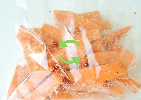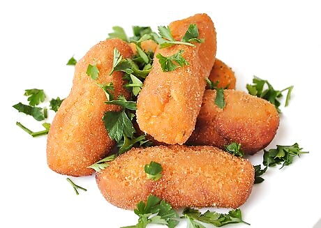 Season your butternut squash. Depending on what recipe you’re using, you may season your squash before or after you deep fry it. For example, if you are making butternut squash fries, try putting the cut up slices into a plastic bag with a tablespoon or two of cornstarch and shaking it. You can also add a bit of paprika and garlic salt for a kick. If you are making fritters, try mixing flour, baking powder, and salt with milk, maple syrup, and an egg. You can then add your mashed or shredded butternut squash to this mixture.