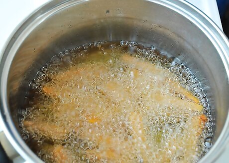 Set up your pot or fryer. If you don’t have a deep fryer, use a large pot with high walls. Ideally, there should be ten centimeters to four inches of space between the oil and the top of the pot. However, you want to make sure that you have enough oil to submerge your food, so use your best judgment. For deep fryers, simply fill the fryer up to the oil line with the oil of your choice. When working without a deep fryer, try filling the pot only halfway. This will help prevent spillover and splattering. Heat the oil to 350 degrees F (175 C). You can use a candy thermometer or other kitchen thermometer that hooks onto the pot to monitor the temperature.