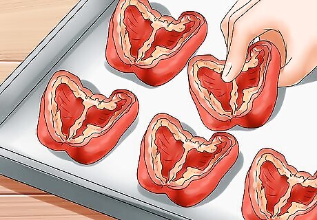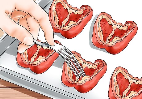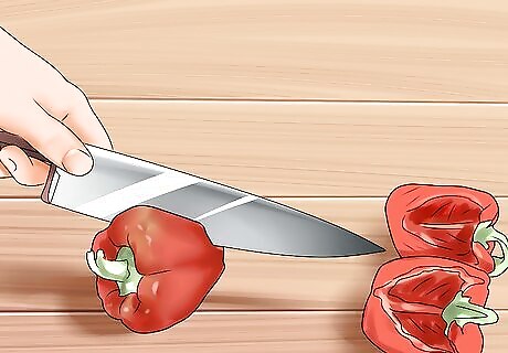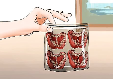 Slice your fruits and vegetables into even slices. Be sure to peel and core fruits like peaches, apricots, apples, pineapples, and pears before dehydrating. For corn, cut the actual corn off of the cob instead drying the entire vegetable. Remove the seeds from peppers after you have sliced them. You can leave mushrooms whole if you wish.