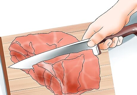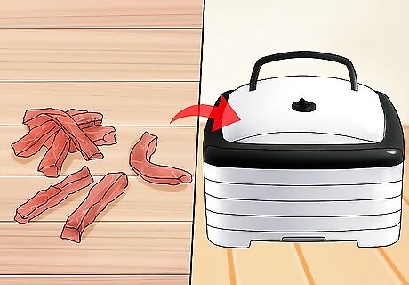 Cut your meat into smaller slices. Be sure your slices are uniformly cut so that dehydration occurs consistently throughout your meat. Slice ham into 1-inch wide strips. They should look like slightly thicker slices of bacon. Cut beef into long, 1/4-inch wide strips if you are making beef jerky. Pull chicken apart into small pieces. It should look very similar to pulled pork. If you plan on consuming meats after they have been dried, be sure that your ham and chicken are precooked. Raw, dehydrated beef is okay to consume as it will turn into beef jerky. Eating raw dehydrated pork can cause an infection called trichinosis, which occurs when raw or under-cooked pork is consumed. Similarly, eating raw chicken can give you salmonella food poisoning.