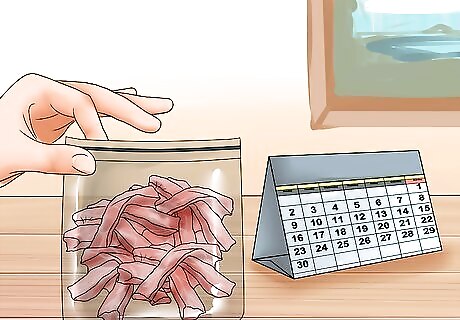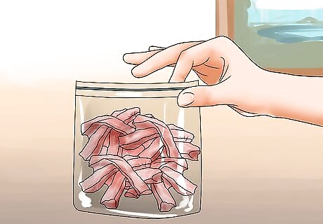 Store your dehydrated meats in airtight plastic bags. Remember, air also contains moisture, and moisture is the enemy of dried foods. If you're storing the meat shorter than a month, store it in a dry, dark place at room temperature. Your kitchen cupboard should be ideal for dried meats. Don't worry about spoilage; removing the water content prevents meats from spoiling. For long term storage, place meat in the freezer or refrigerator.