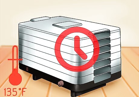 Dry the larger fruits or vegetables at 130–135 °F (54–57 °C) for 6-12 hours. For smaller vegetables like corn, broccoli, mushrooms, and peas, drying for 3-10 hours will be sufficient. These times vary from plant to plant and depends largely on the water content of the food. Most fruits dry at the same temperature and for the same amount of time, but some vegetables have drastically different drying times. The most different drying times belong to corn, broccoli, mushrooms, and peas. Since these vegetables are small and contain less water, they tend to dry in half the time of other vegetables.