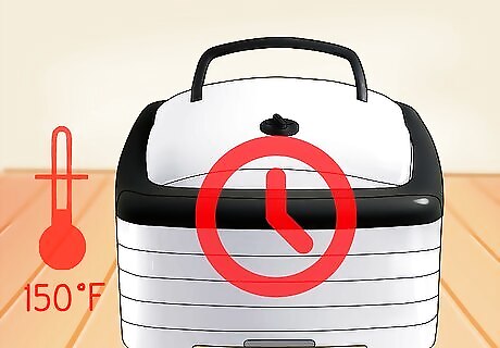 Dry the meat at 145–155 °F (63–68 °C) for about 6 hours. These times and temperatures may vary slightly for different meats but should yield an overall similar result. If making beef jerky, monitor your slices to make sure they are pliable but not brittle. This means they should bend without actually breaking.