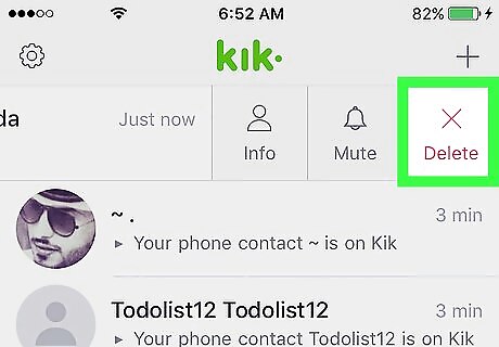 Select a contact to delete. On the main Kik screen, either: Swipe left on a person's name (iPhone or iPad); or Tap and hold a person's name (Android).
